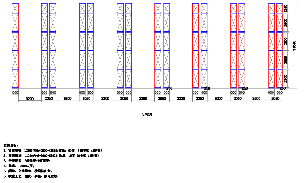 2、貨架規(guī)格:L1250*D900*H3525 數(shù)量:15套 (0主 15副)