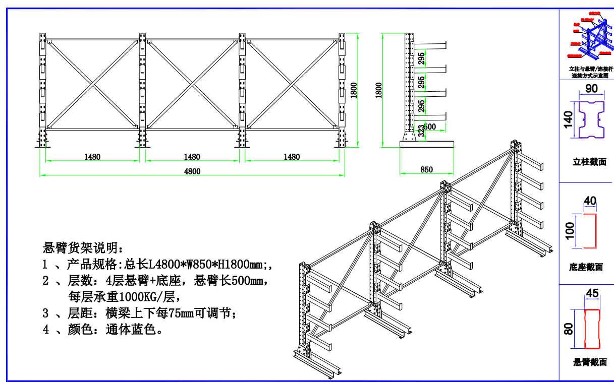 懸臂貨架說(shuō)明:規(guī)格L4800*W850*H1800 層數(shù) 4層懸臂+底坐,懸臂長(zhǎng)500. 每層承重1000KG/層,層間距:橫梁上下每75mm可調(diào)節(jié) 顏色:通體藍(lán)色