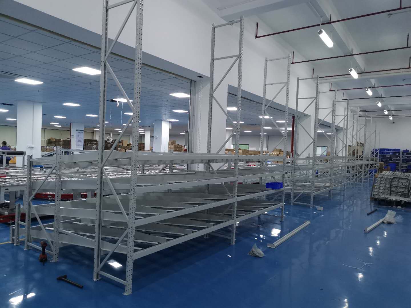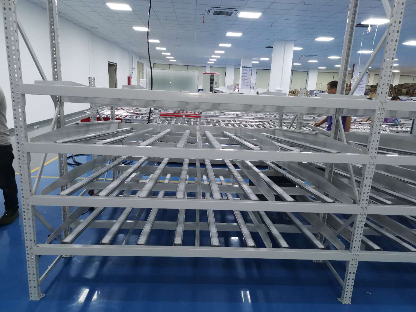 流利式貨架根據組成貨架的基本框架的材質可分為重型流利式貨架和中B型流利式貨架。流利貨架的流利條直接連接到前后橫梁及中間支撐梁上,橫梁直接掛在支柱上,流利條安裝傾斜度取于貨箱的尺寸、重量以及流利架的深度,通常取5%~9%。當滾道較長時,可用分隔板將滾道隔開。取貨端需安裝制動片使貨物減,降低沖擊。