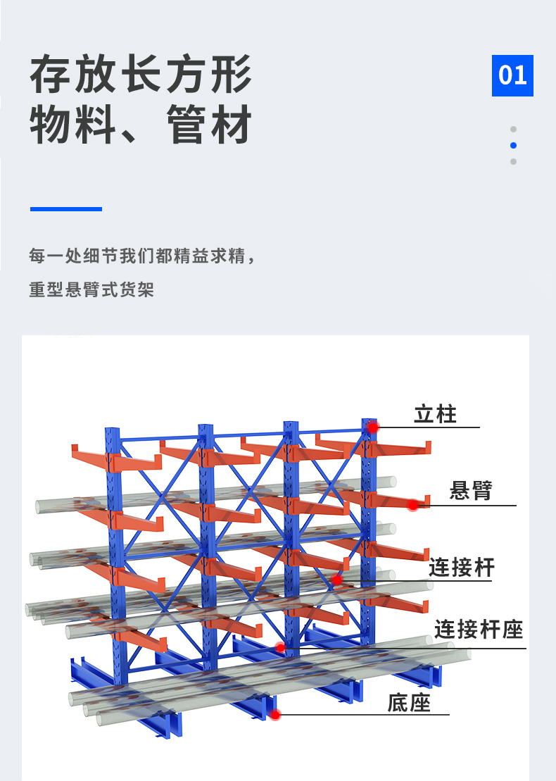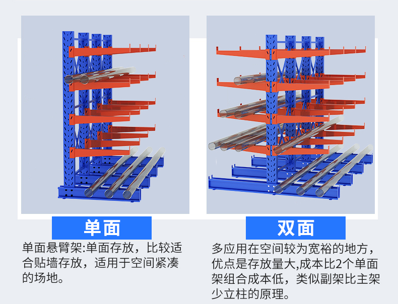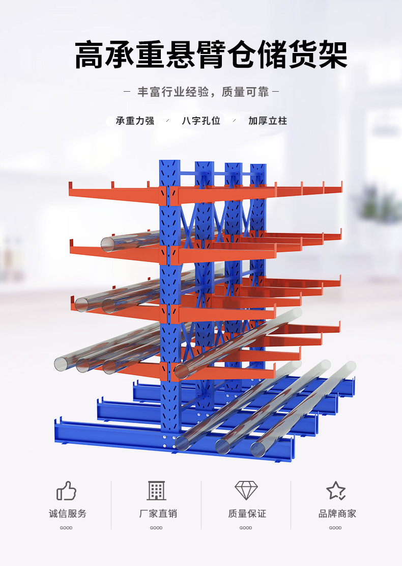 懸臂式貨架是貨架中重要的一種。適用于存放長物料、環型物料、板材、管材及不規則貨物。可以是單面或雙面,懸臂式貨架具有結構穩定,載重能力好、空間利用率高等特點。懸臂式貨架立柱多采用H型鋼或冷軋型鋼,采用方管、冷軋型鋼或H型鋼,懸臂與立柱間采用插接式或螺栓連接式,底座與立柱間采用螺栓連接式,底座采用冷軋型鋼或H型鋼。